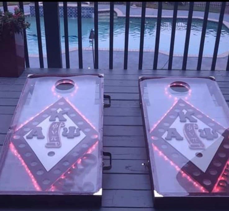 Deluxe Kappa Alpha Psi Corhole boards with battery operated 3 ft. lighted diamond in each one! Plexiglass cover on top and bottom of diamond for a see-through effect day or night. Krimson and